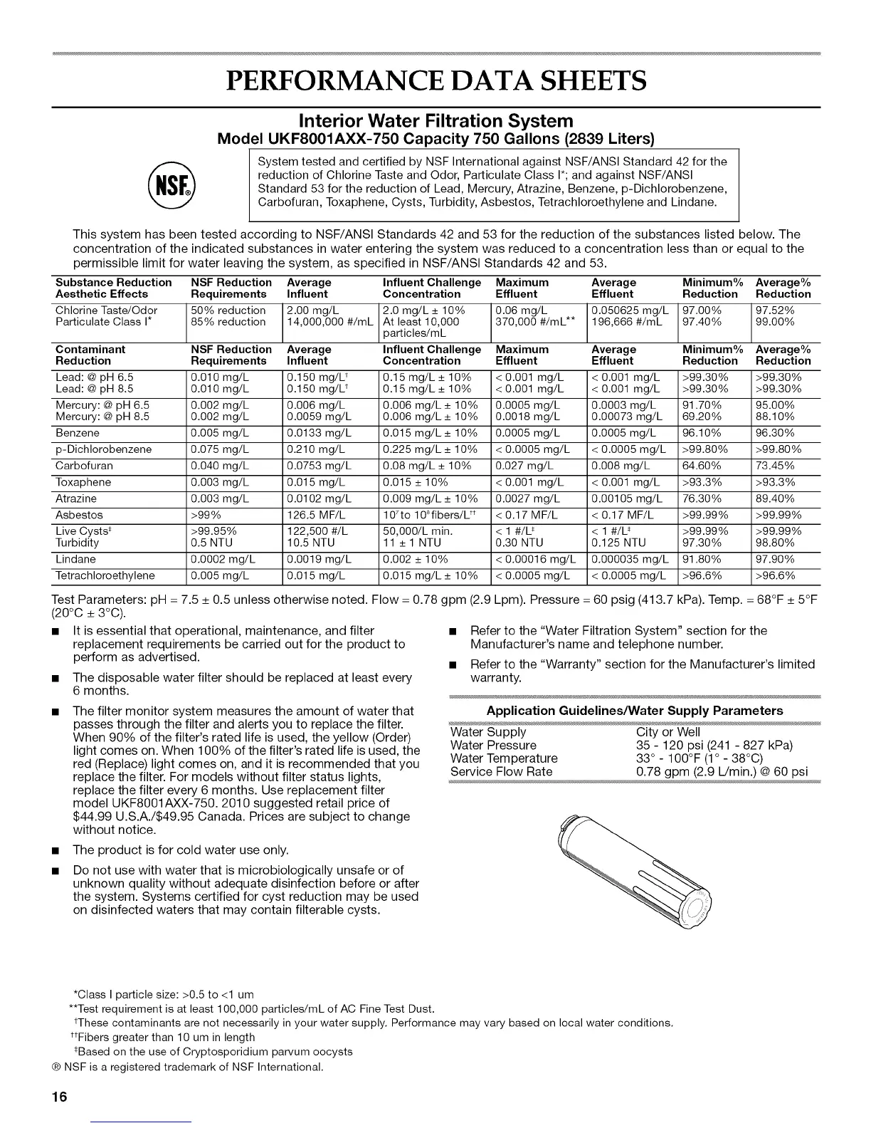 Contaminant NSF Reduction Average Influent Challenge Maximum Average Minimum% Average%
