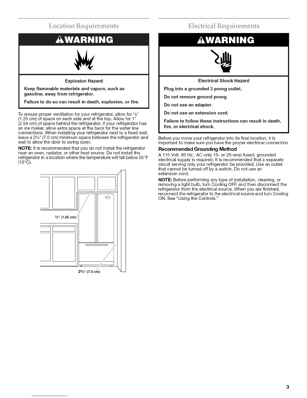 leave a 23/4'' (7.0 cm) minimum space between the refrigerator and