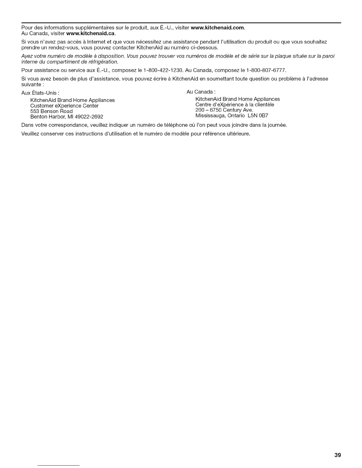 Pour des informations supplementaires sur le produit, aux €:.-U., visiter www.kitchenaid.com.