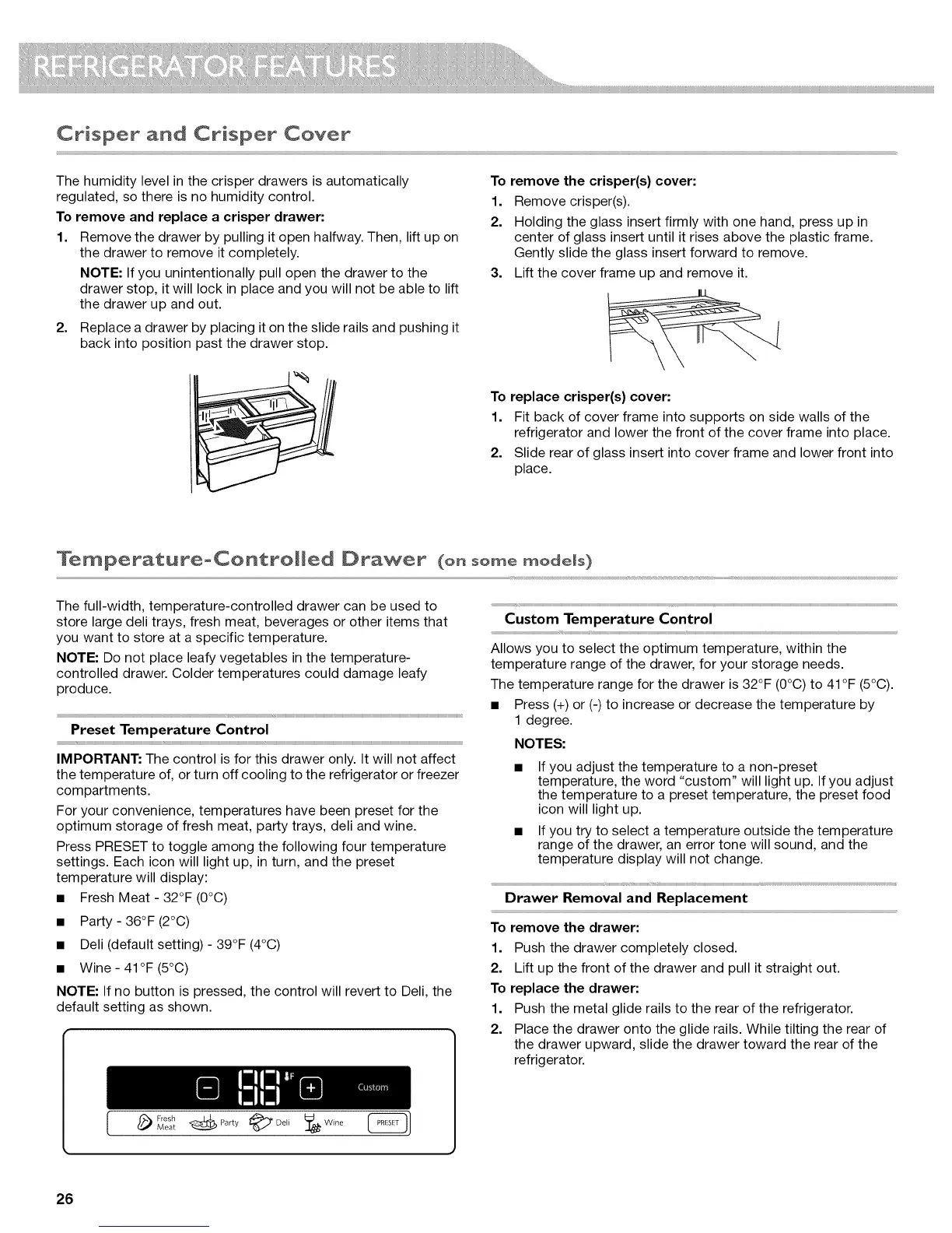 The temperature range for the drawer is 32°F (0°C) to 41°F (5°C).