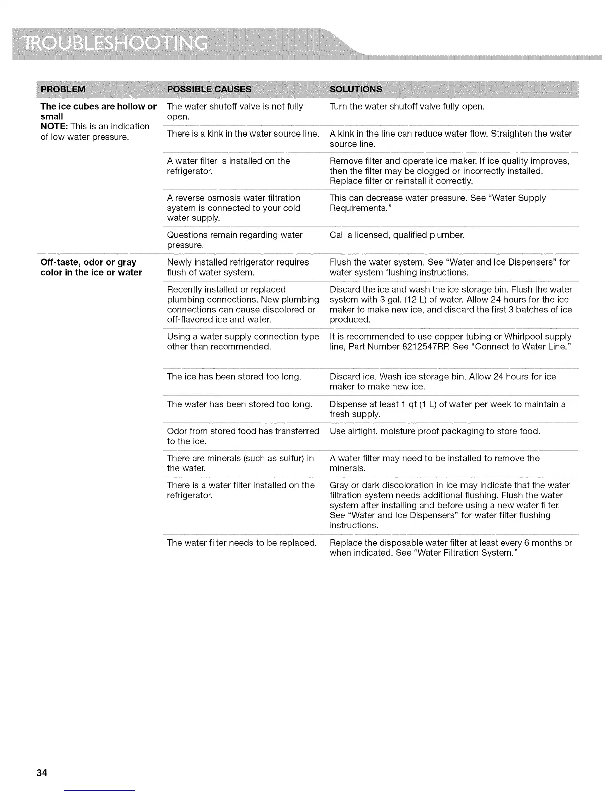 Off-taste, odor or gray Newly installed refrigerator requires Flush the water system. See "Water and Ice Dispensers" for