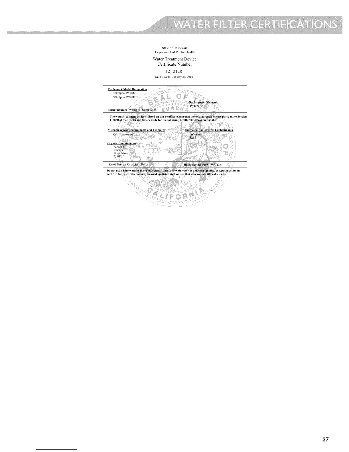 KitchenAid KFIS29BBBL00 - Water Filter Certifications
