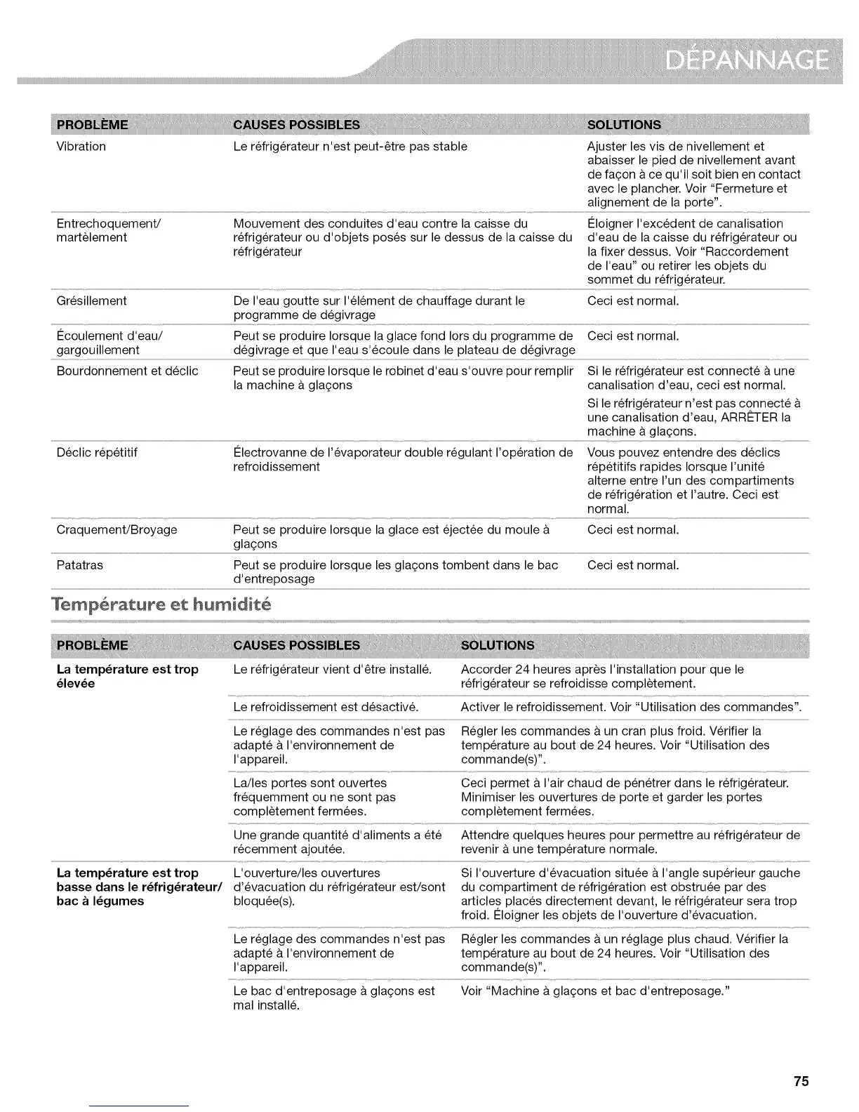 Vibration Le refrig6rateur n'est peut-_tre pas stable Ajuster les vis de nivellement et