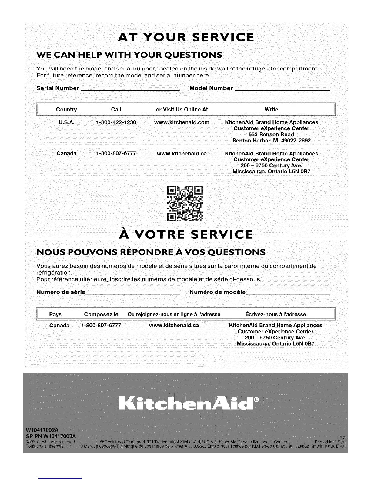 Canada 1-800-807-6777 www.kitchenaid.ca KitchenAid Brand Home Appliances