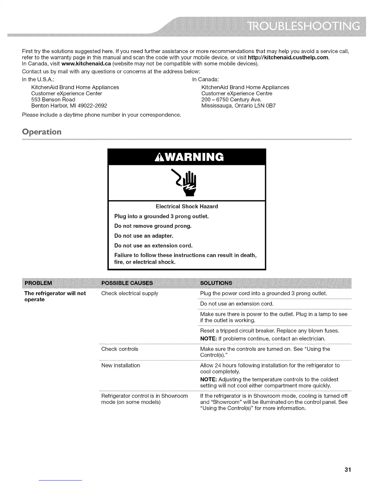 KitchenAid KFIS29BBMS03 - TROUBLESHOOTING; Operation and Control Issues