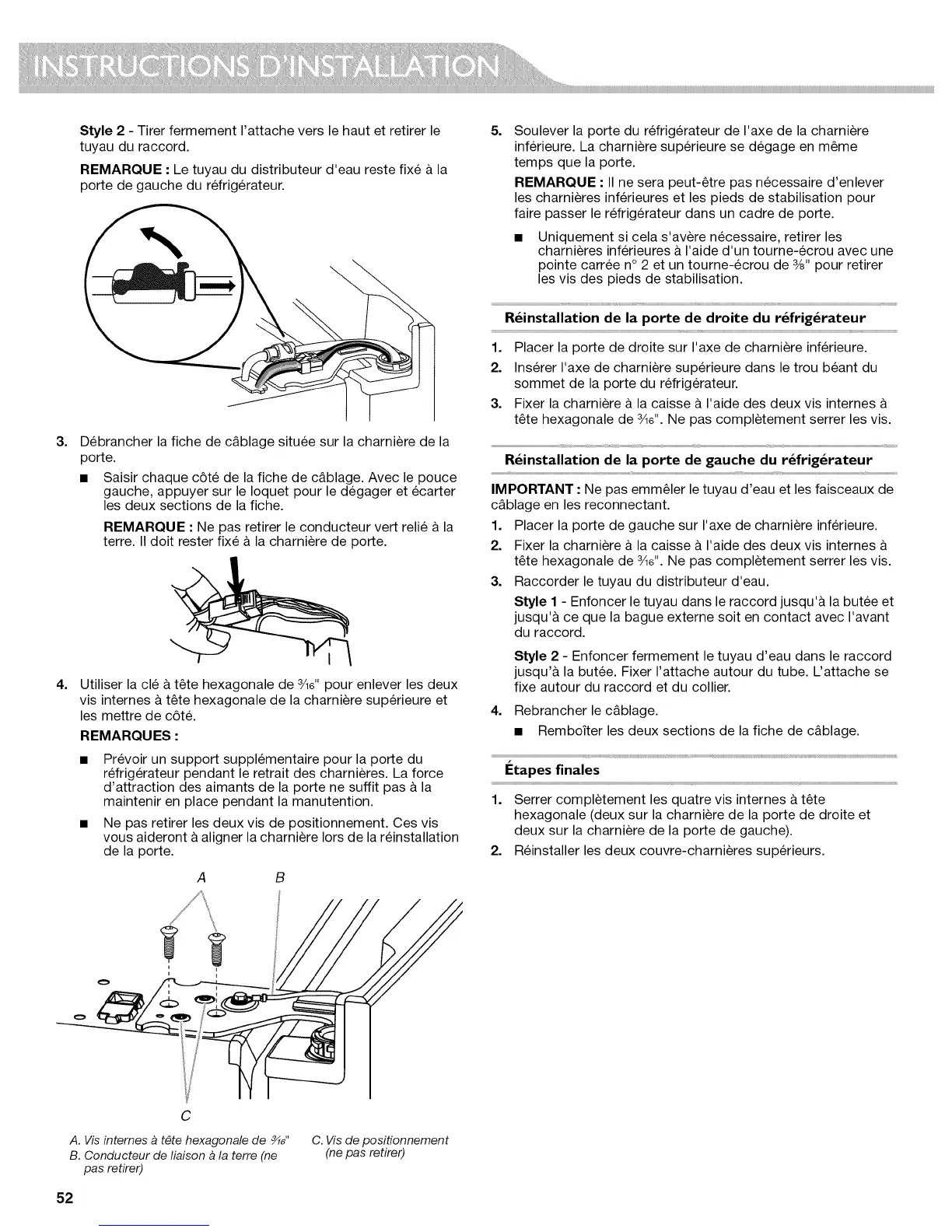KitchenAid KFIS29BBMS03 - Reinstallation de la Porte de Droite du Refrigerateur; Reinstallation de la Porte de Gauche du Refrig6 Rateur; Etapes Finales