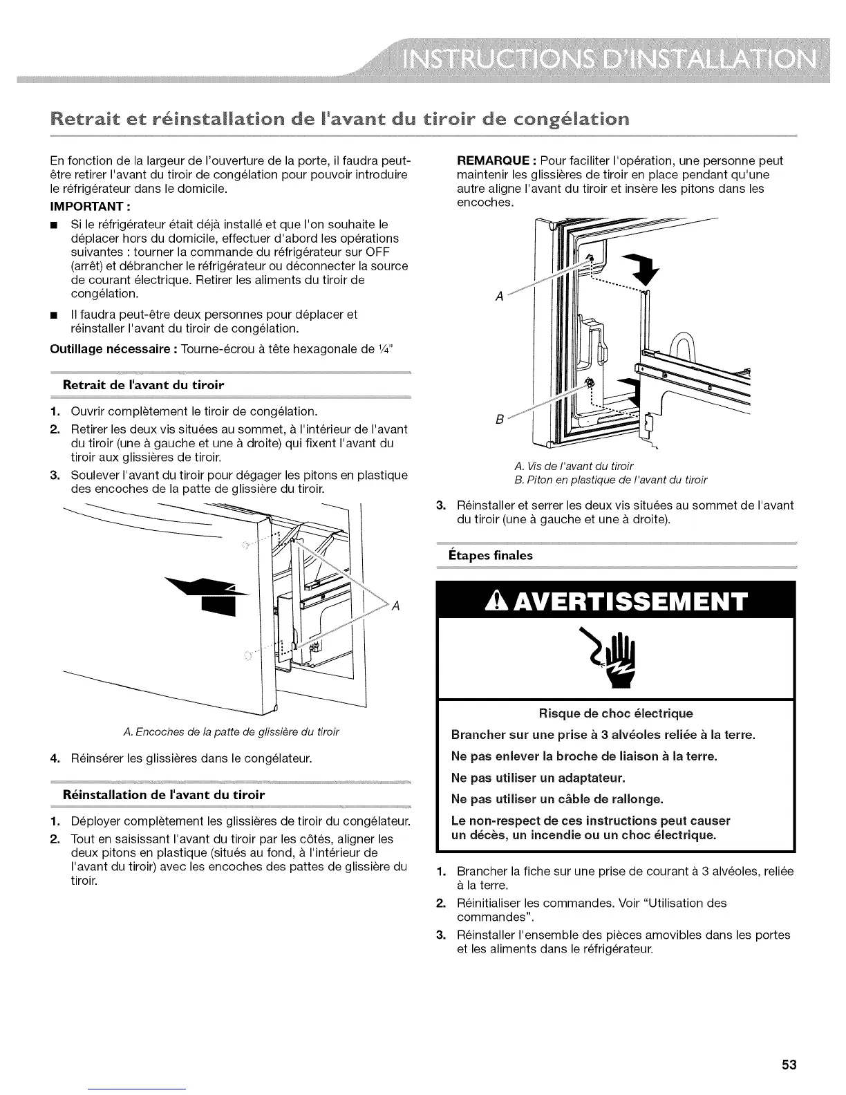 KitchenAid KFIS29BBMS03 - Retrait Et Reinstallation de Iavant du Tiroir de Congelation; Retrait de Iavant du Tiroir; Reinstallation de Iavant du Tiroir; Etapes Finales