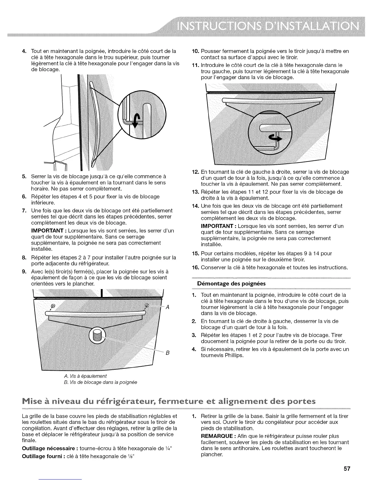 KitchenAid KFIS29BBMS03 - Demontage des Poignees; Mise a Niveau du Refrigerateur, Fermeture Et Alignement des Portes