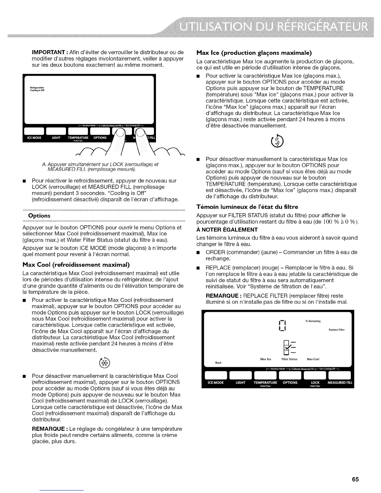 (gla£_onsmax.) et Water Filter Status (statut du filtre a eau).