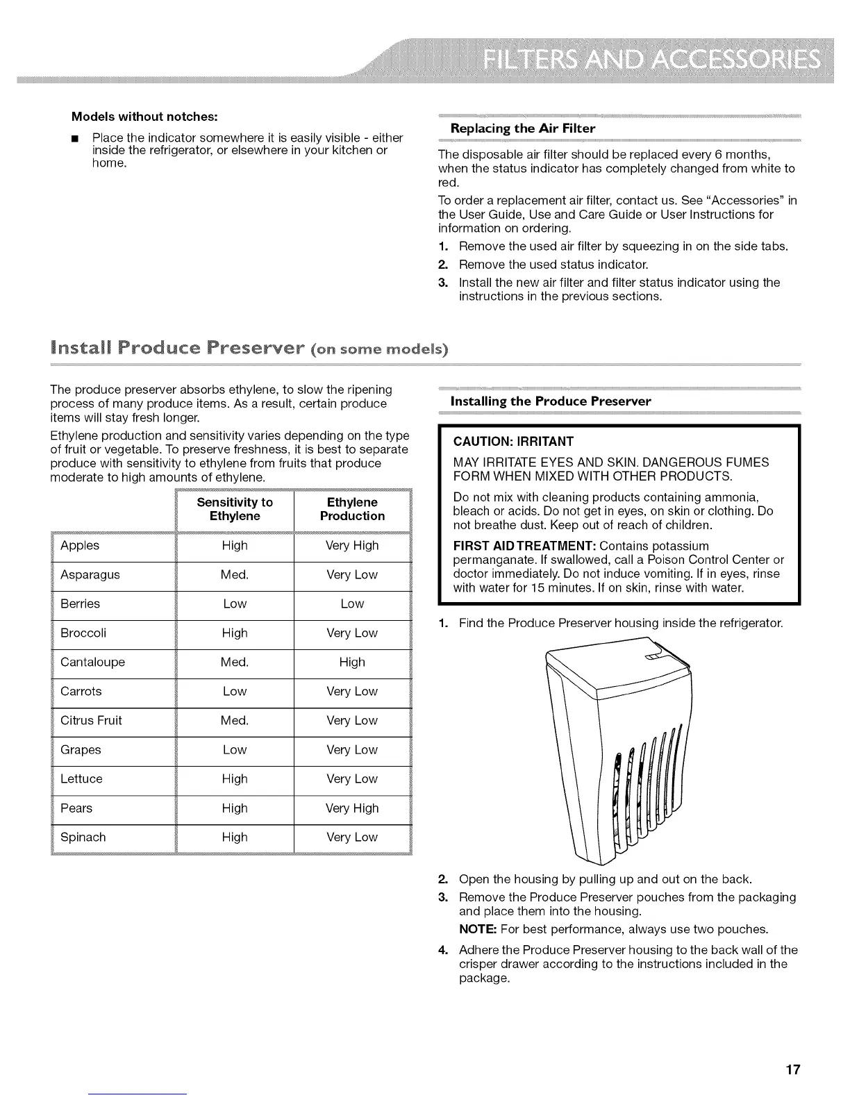 KitchenAid KFIS29PBMS03 - Replacing the Air Filter; Install Produce Preserver (on some Models); Installing the Produce Preserver