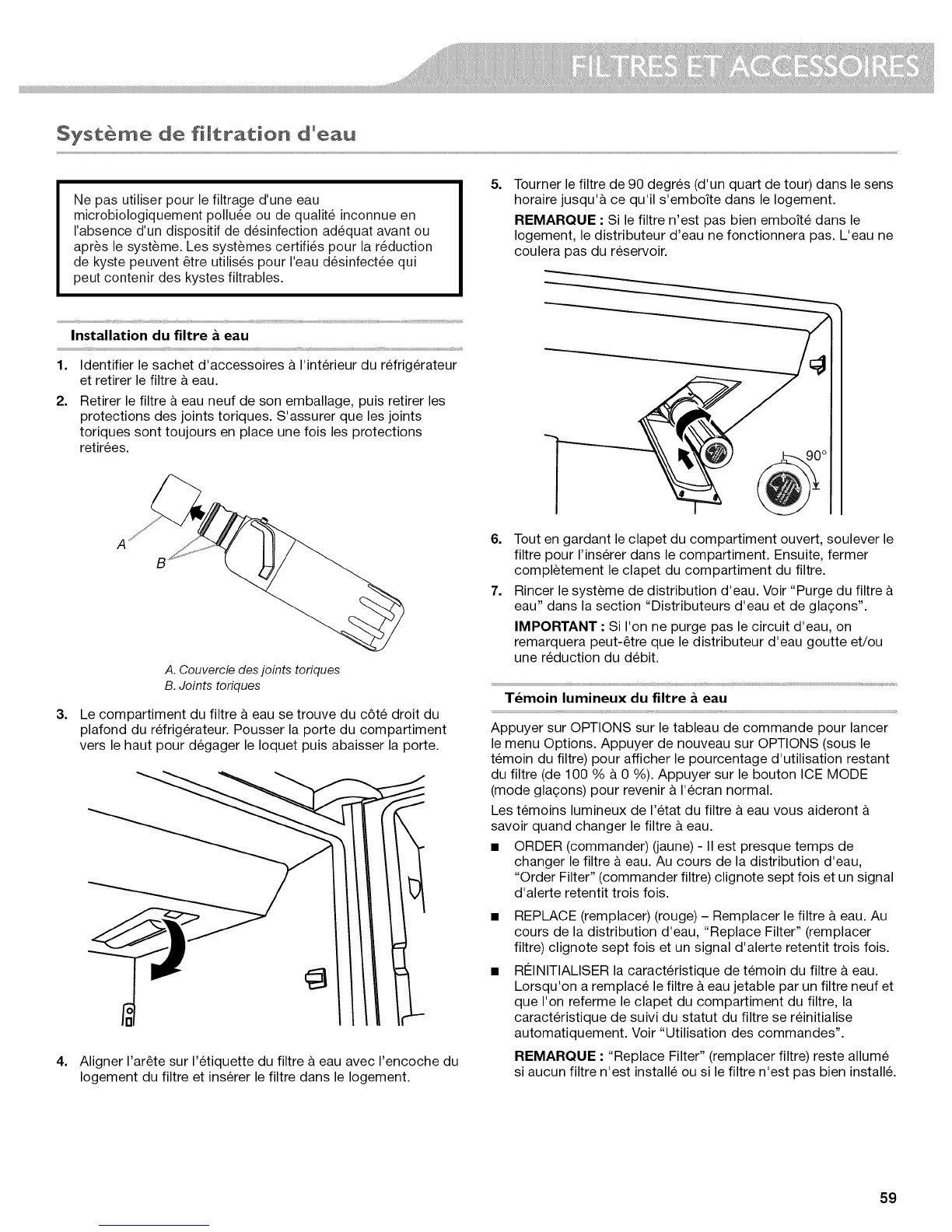 KitchenAid KFIS29PBMS03 - Filtres Et Accessoires; Systeme de Filtration Deau; Installation du Fl;Tre a Eau; Temoin Lumineux du Filtre a Eau