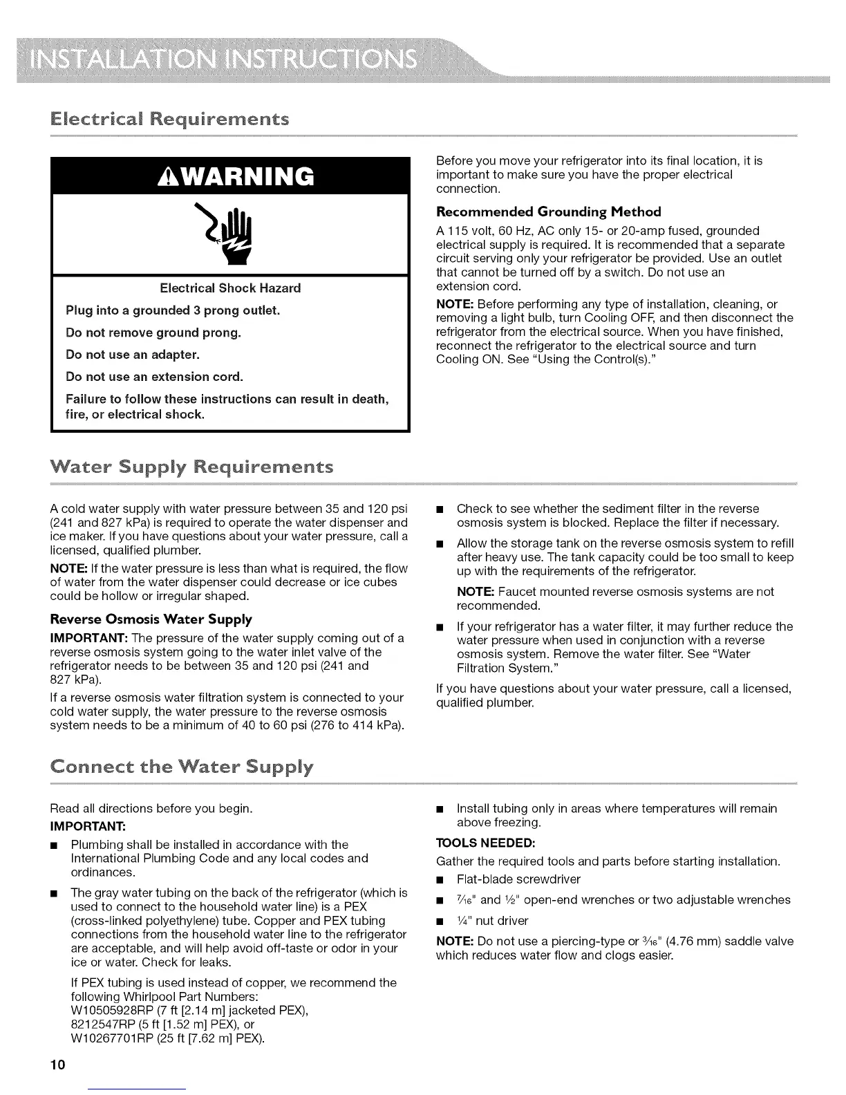 KitchenAid KFIV29PCMS03 - Electrical and Water Supply Requirements; Connecting the Water Supply