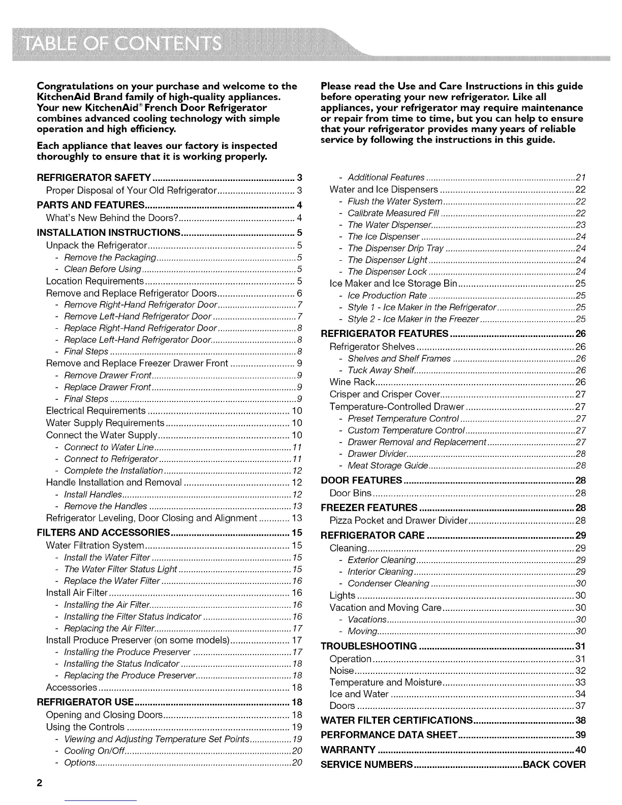 WATER FILTER CERTIFICATIONS ....................................... 38