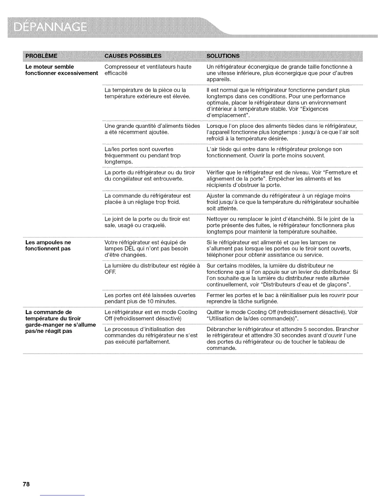 La porte du refrig6rateur ou du tiroir Verifier que le refrig6rateur est de niveau. Voir "Fermeture et