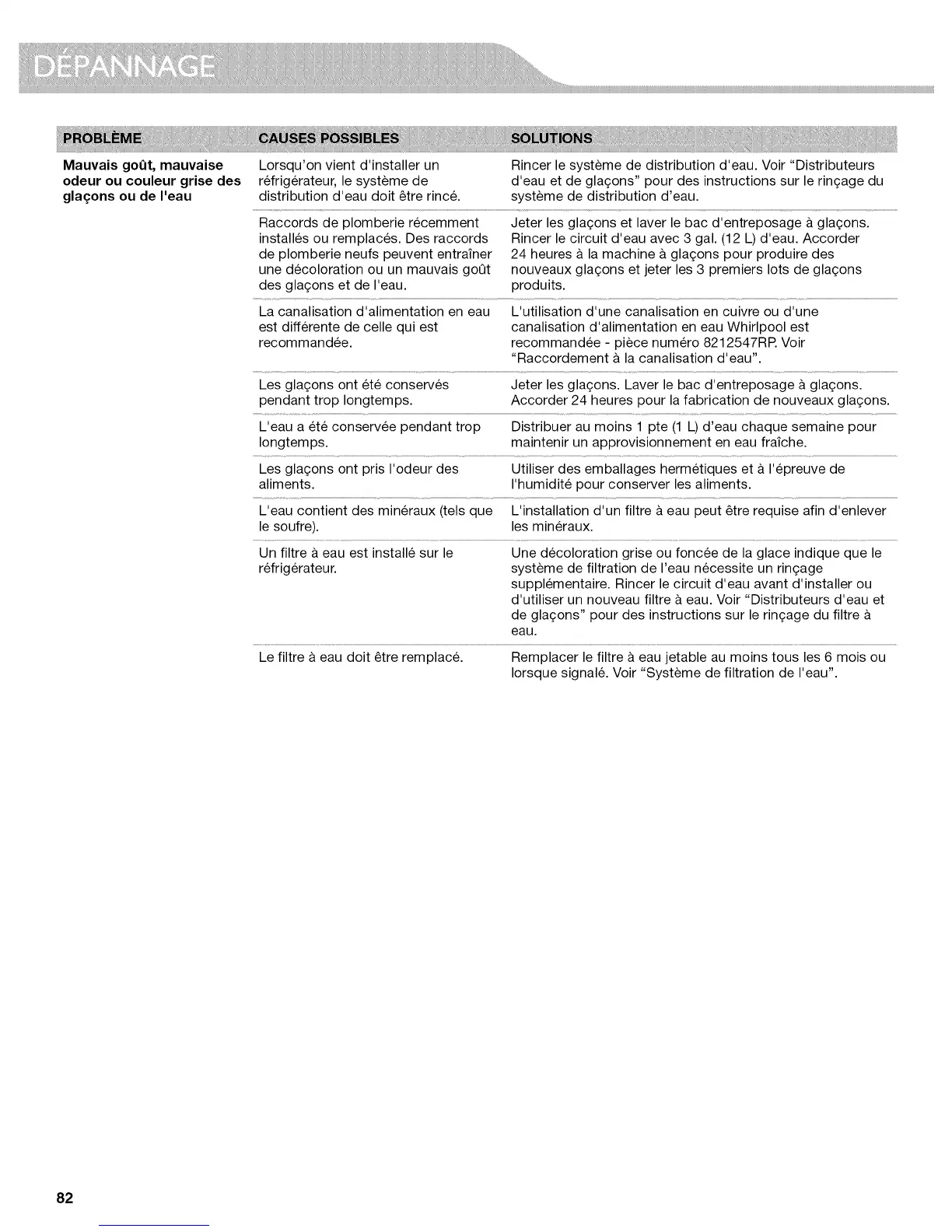 Le filtre a eau doit _tre remplace. Remplacer le filtre & eau jetable au moins tous les 6 mois ou