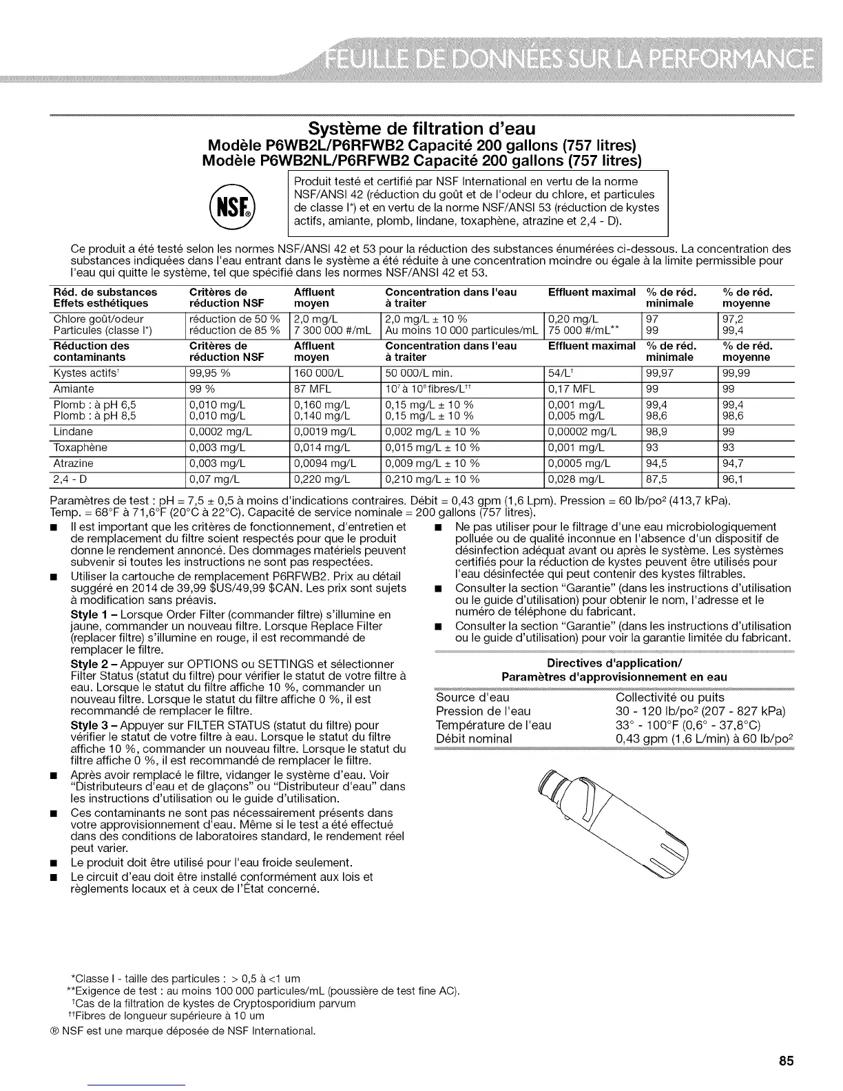 Parametres de test : pH = 7,5 _+0,5 & moins d'indications contraires. Debit = 0,43 gpm (1,6 Lpm). Pression = 60 Ib/po 2 (413,7 kPa).