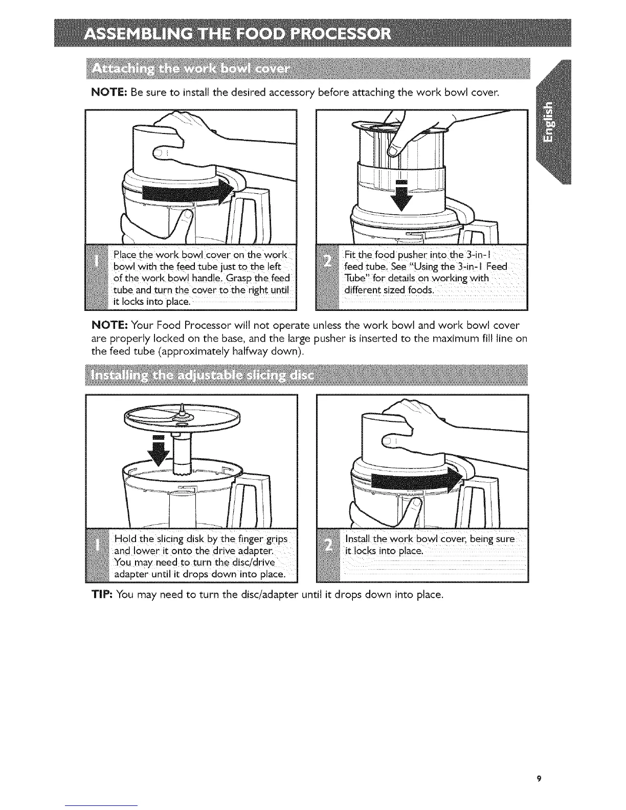 NOTE: Your Food Processor will not operate unless the work bowl and work bowl cover