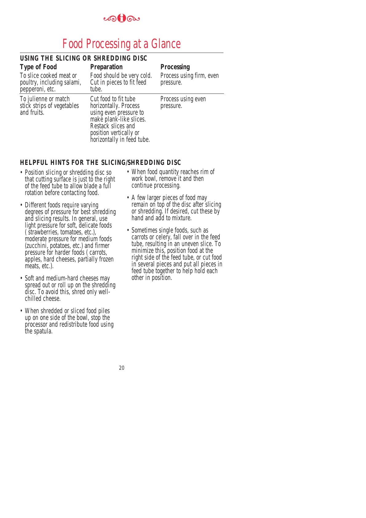HELPFUL HINTS FOR THE SLICING/SHREDDING DISC