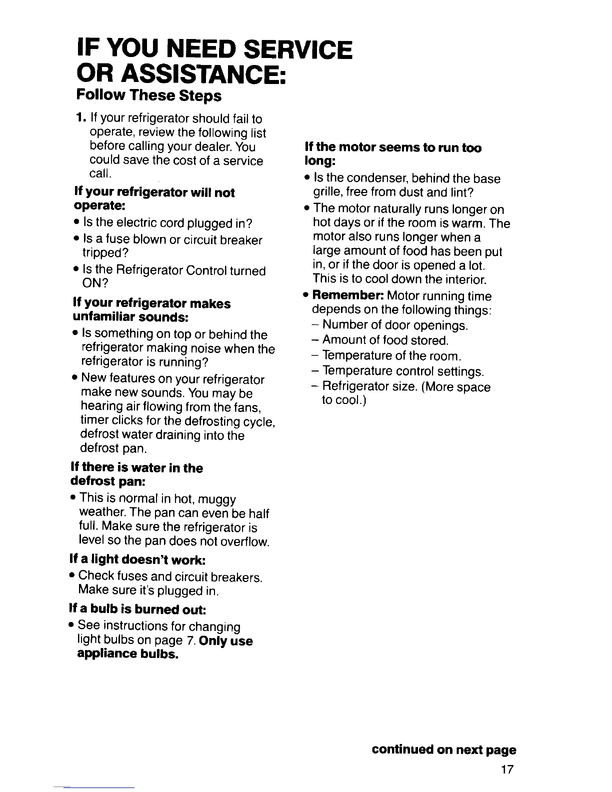 KitchenAid KFRF19MT - Service and Assistance: Troubleshooting; If Your Refrigerator Will Not Operate; If Your Refrigerator Makes Unfamiliar Sounds; If There Is Water in the Defrost Pan