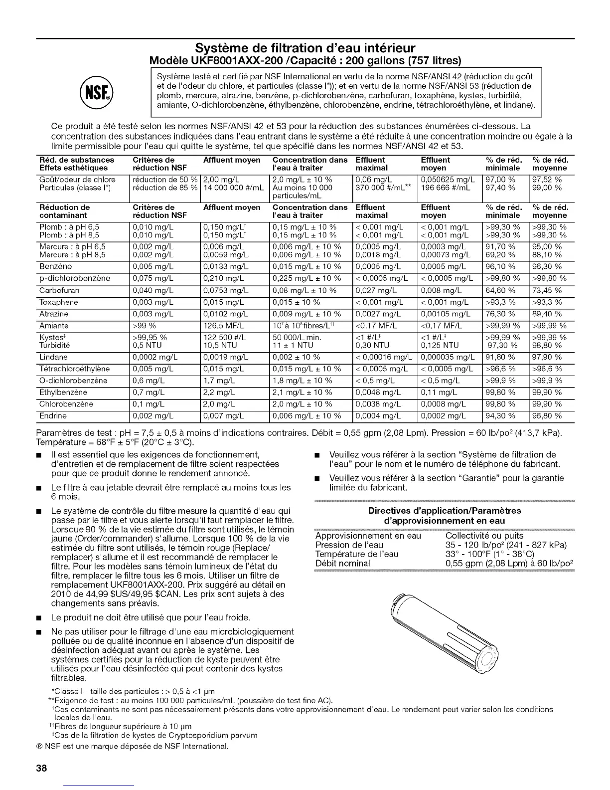 Parametres de test : pH = 7,5 + 0,5 & molns d'indications contraires. Debit = 0,55 gpm (2,08 Lpm). Pression = 60 Ib/po 2 (413,7 kPa).