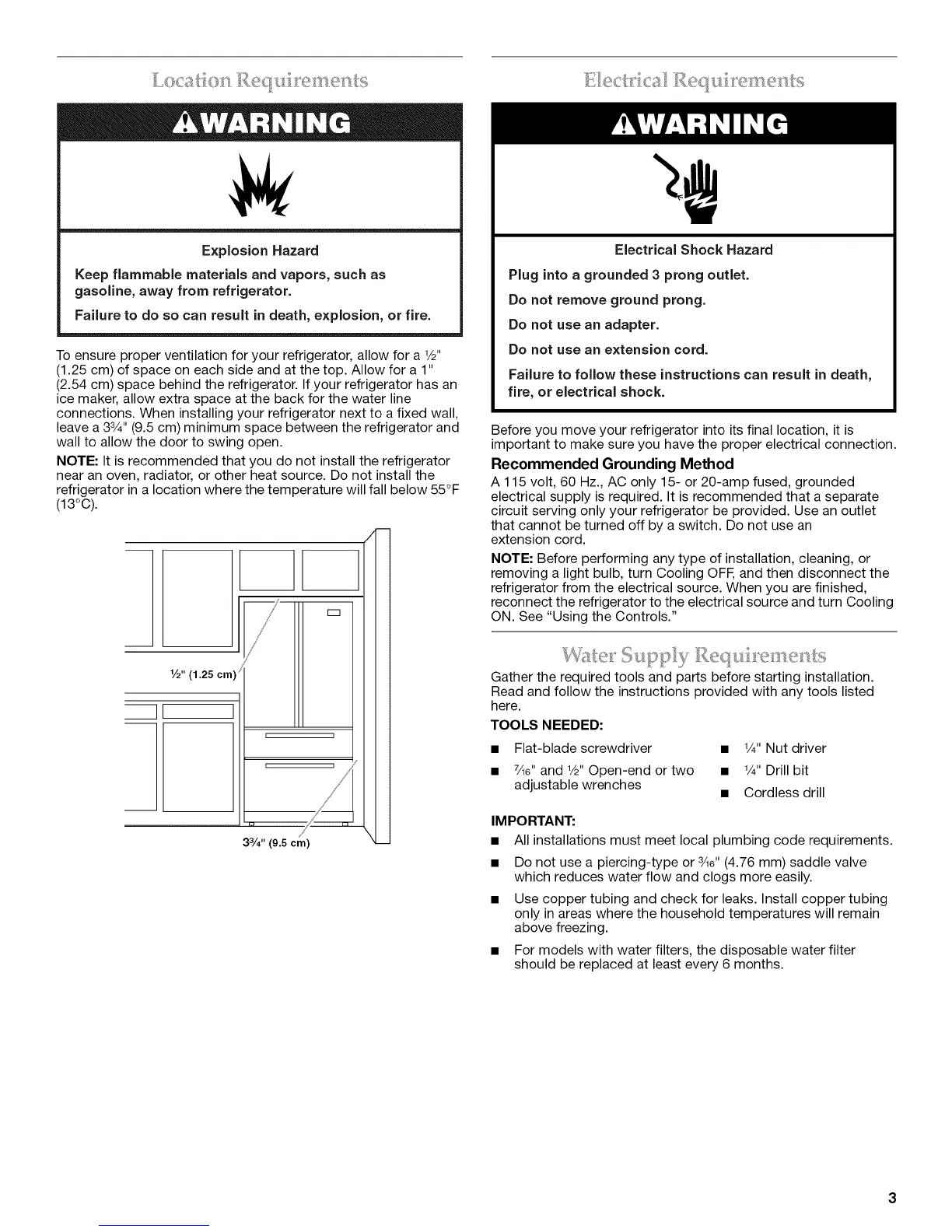 leave a 33/4'' (9.5 cm) minimum space between the refrigerator and
