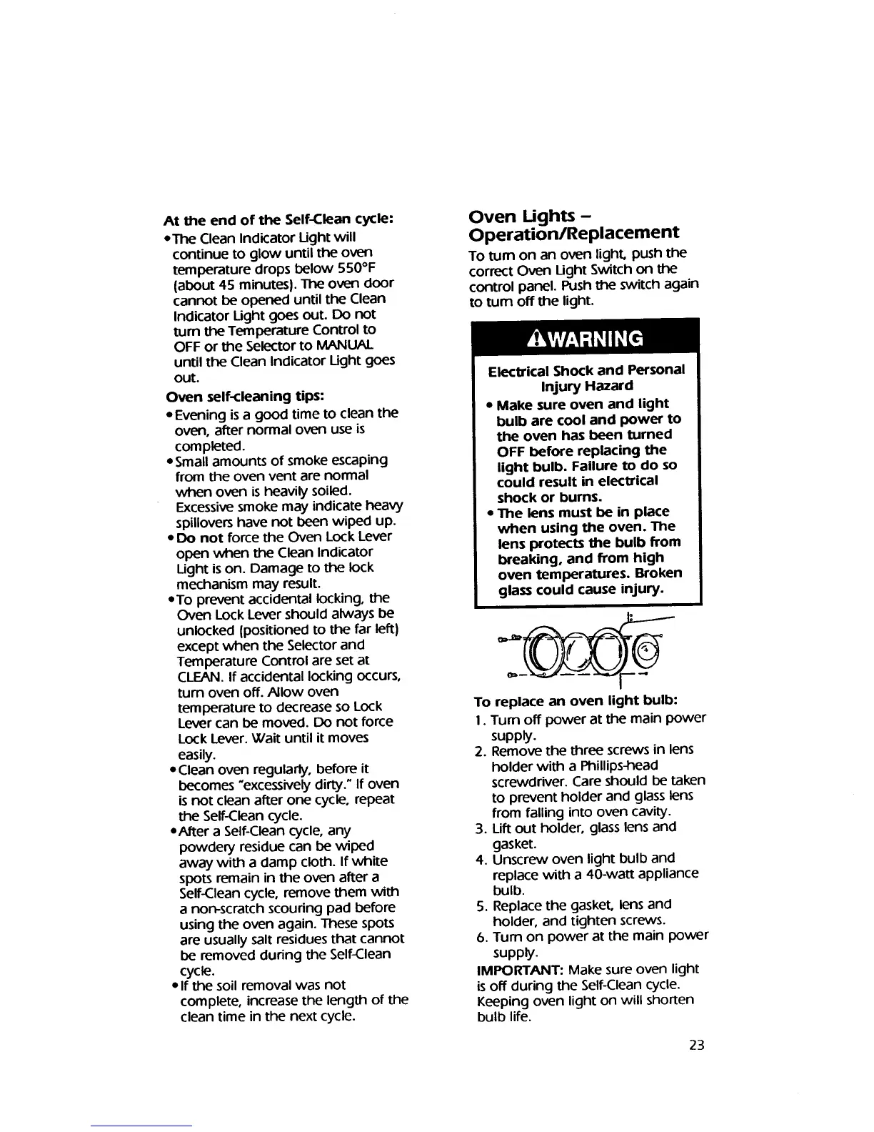 KitchenAid KGBS276X - Oven Light and Self-Clean Final Notes; Oven Light Replacement; Self-Cleaning Tips and End of Cycle