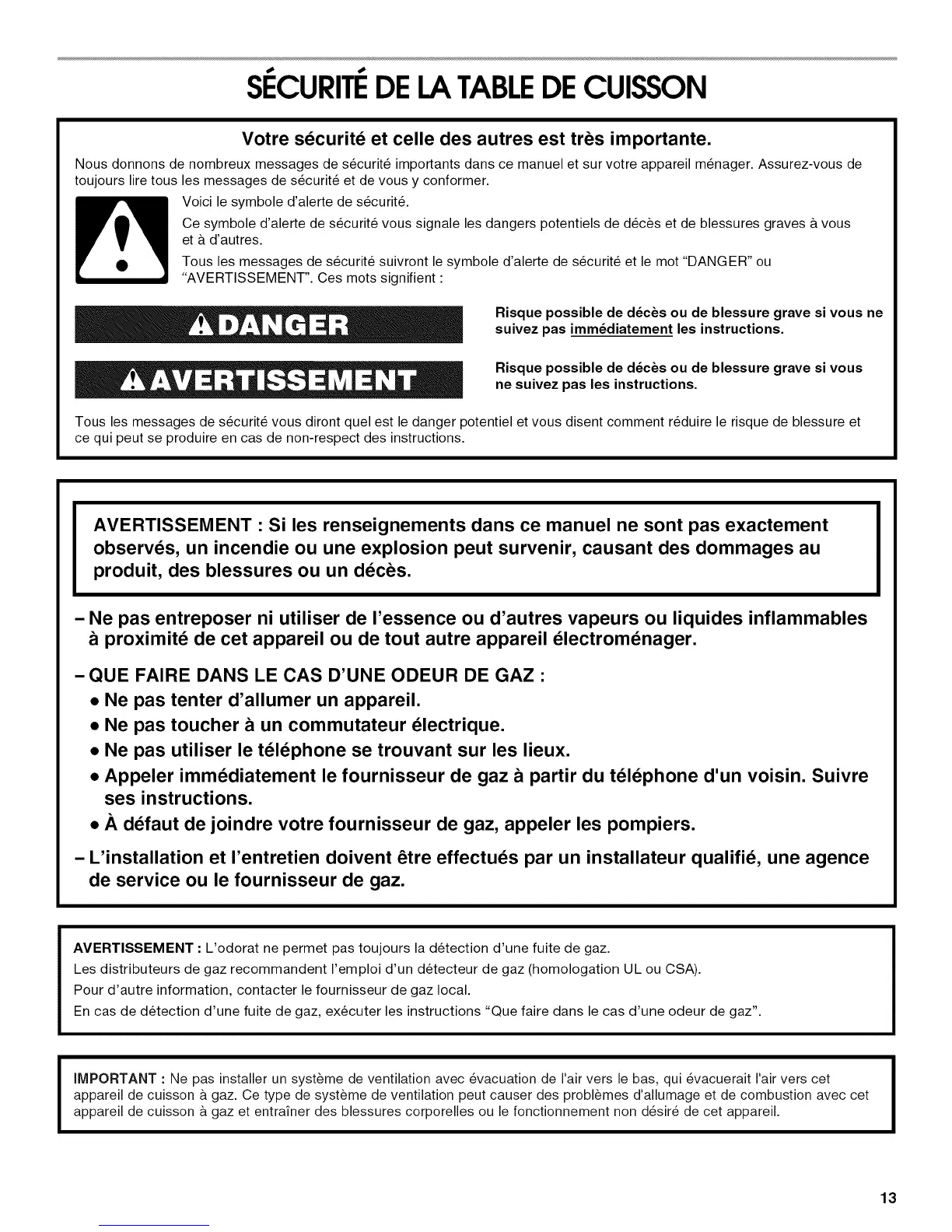 AVERTISSEMENT : L'odorat ne permet pas toujours la detection d'une fuite de gaz.