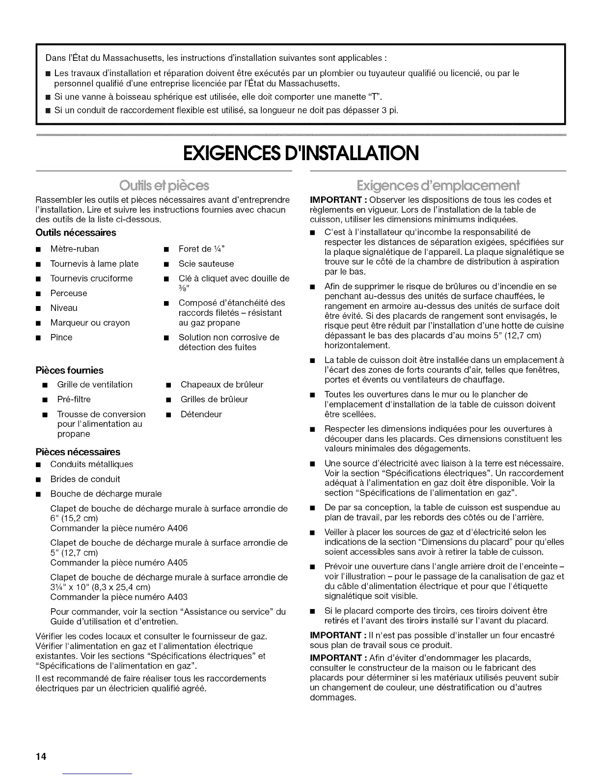 Dans 1'12tatdu Massachusetts, les instructions d'installation suivantes sont applicables •
