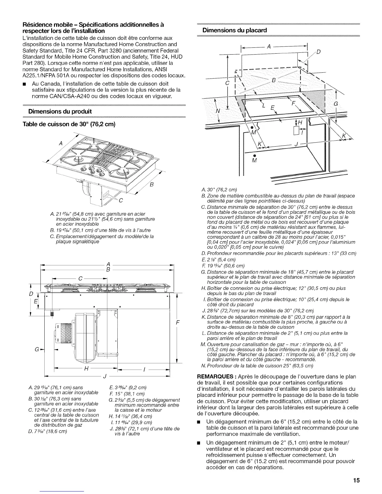 C. Distance minimale de s#paration de 30" (76,2 cm) entre le dessus