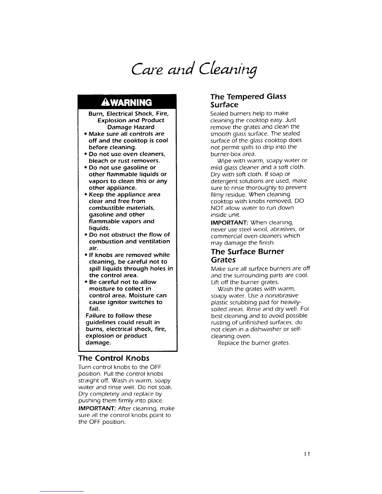 KitchenAid KGCT305X - Care and Cleaning; Cleaning Control Knobs; Cleaning Tempered Glass Surface; Cleaning Surface Burner Grates
