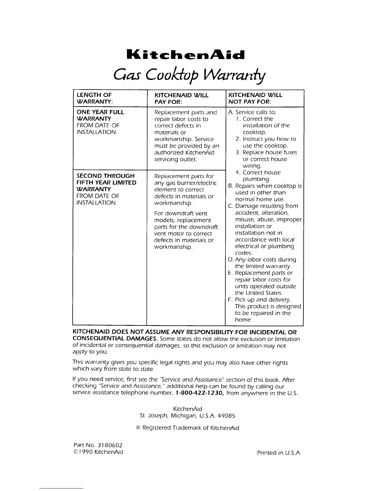 KitchenAid KGCT305X - KitchenAid Gas Cooktop Warranty