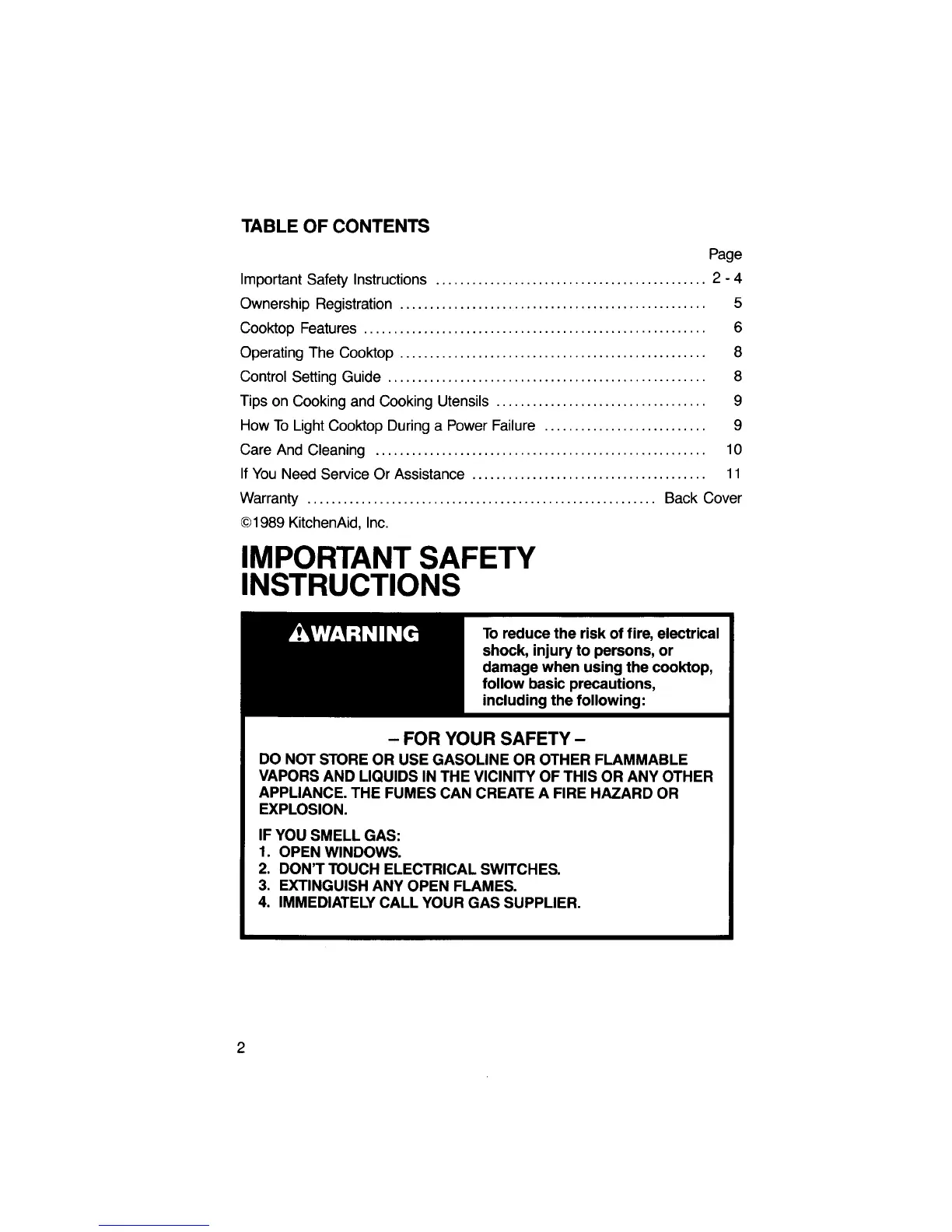 KitchenAid KGCT365T - Important Safety Instructions; FOR YOUR SAFETY; IF YOU SMELL GAS