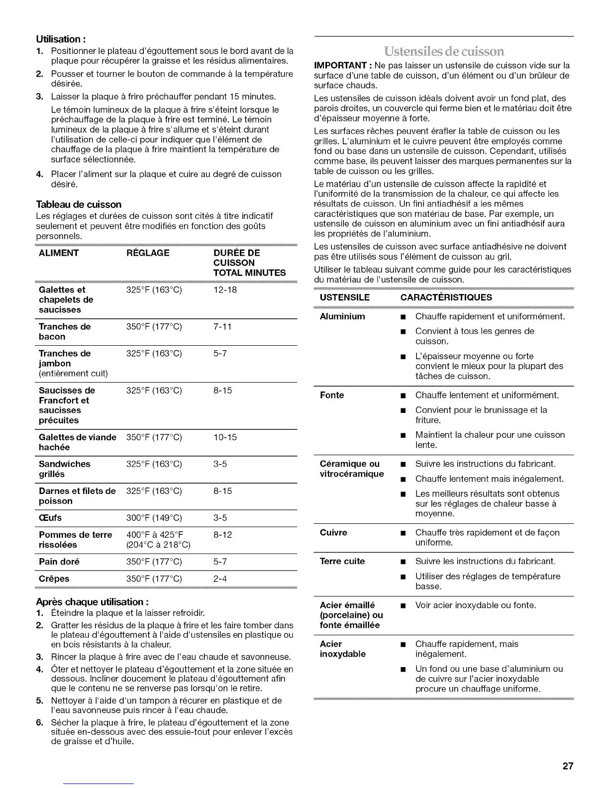 du materiau de I'ustensile de cuisson.