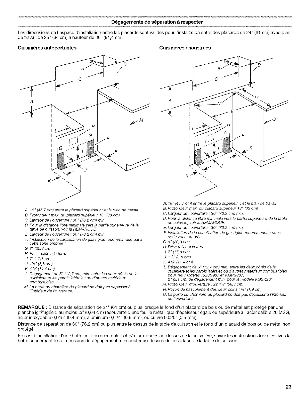 REMARQUE : Distance de separation de 24" (61 cm) ou plus Iorsque le fond d'un placard de bois ou de metal est protege par une