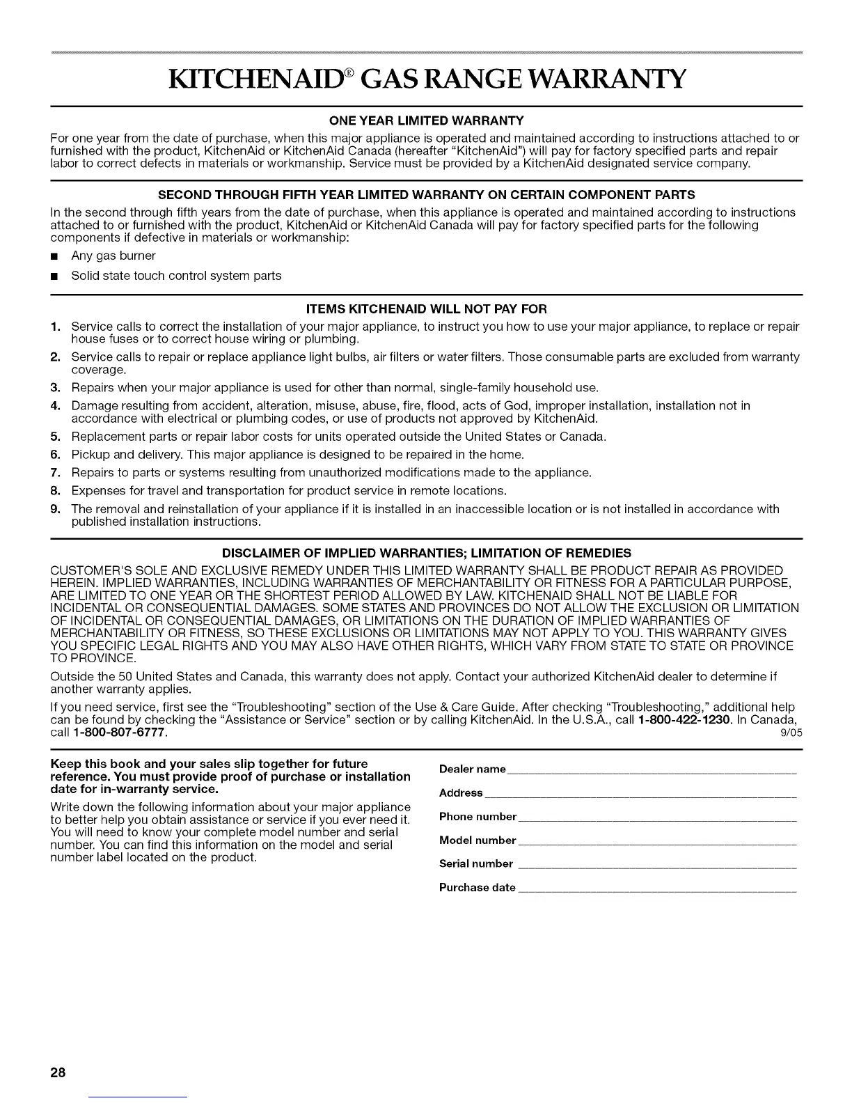 KITCHENAID ®GAS RANGE WARRANTY