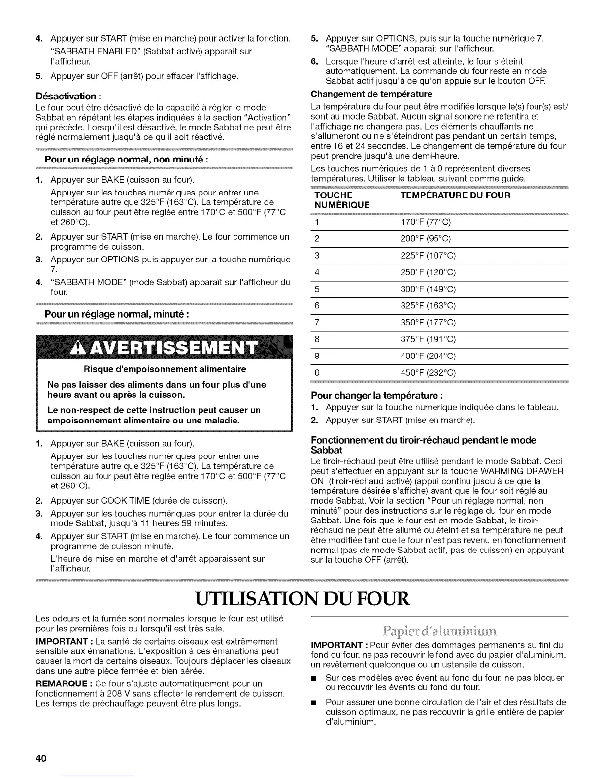 Le tiroir-rechaud peut _tre utilise pendant le mode Sabbat. Ceci