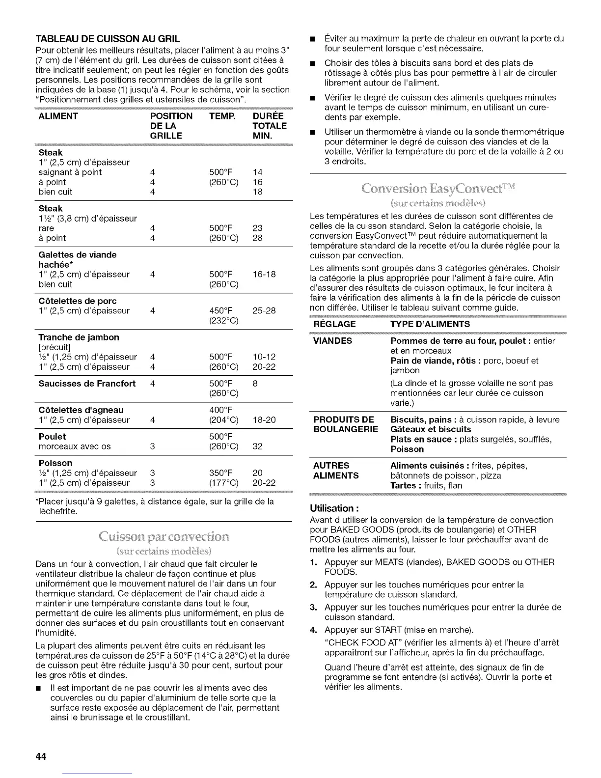 Les temperatures et les durees de cuisson sont differentes de