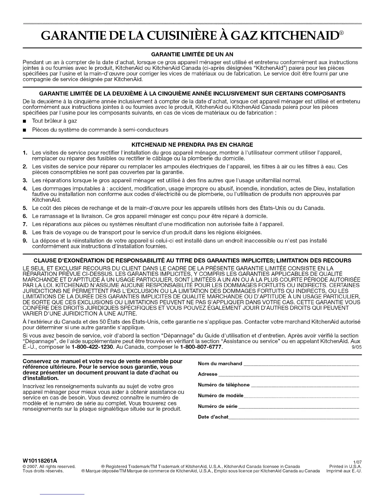 A I'exterieur du Canada et des 50 12tatsdes 12tats-Unis, cette garantie ne s'applique pas. Contacter votre marchand KitchenAid autorise