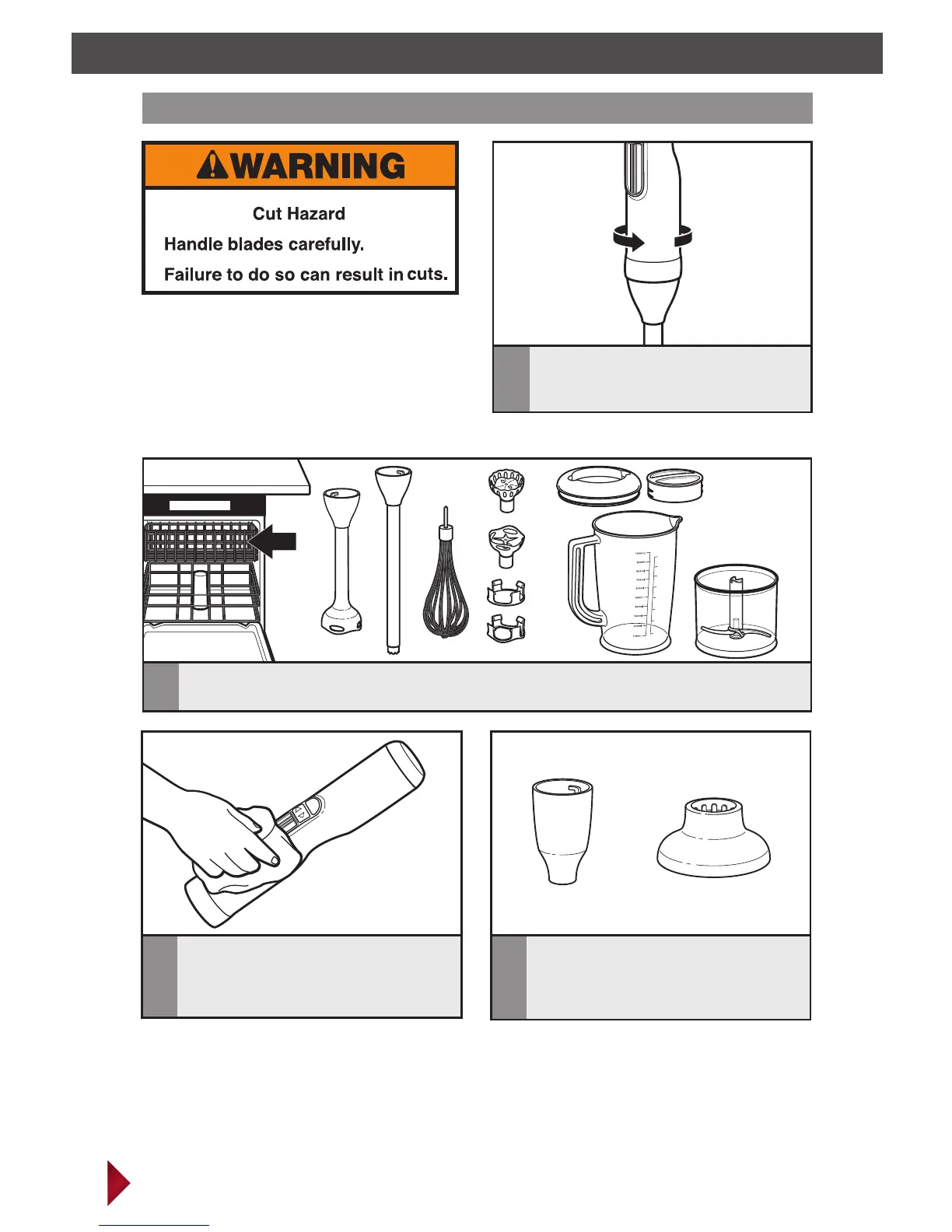 Wash blending arms, pitcher and lid, whisk, chopper bowl, blades, and pan guard in hot,