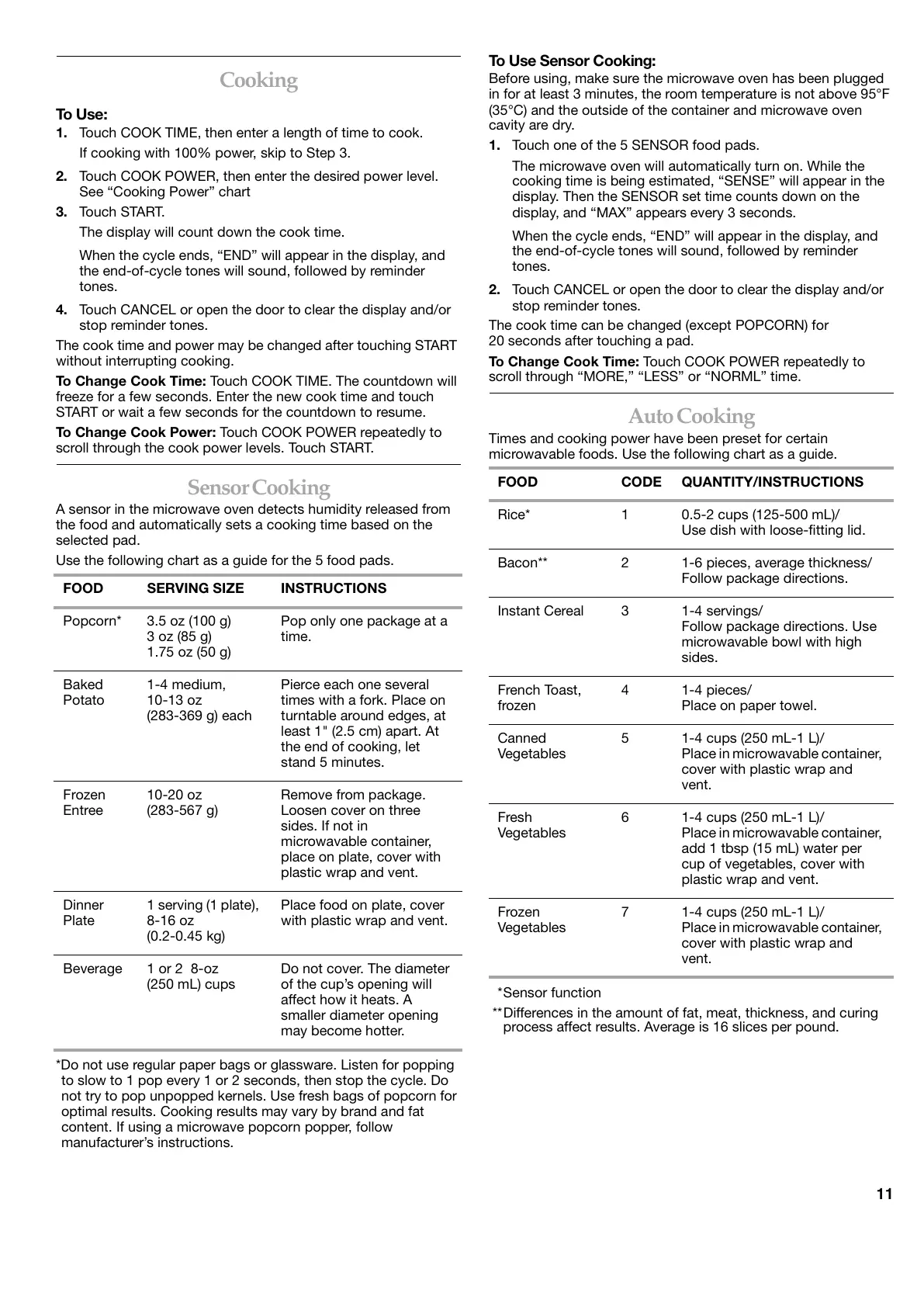 microwavable foods. Use the following chart as a guide.
