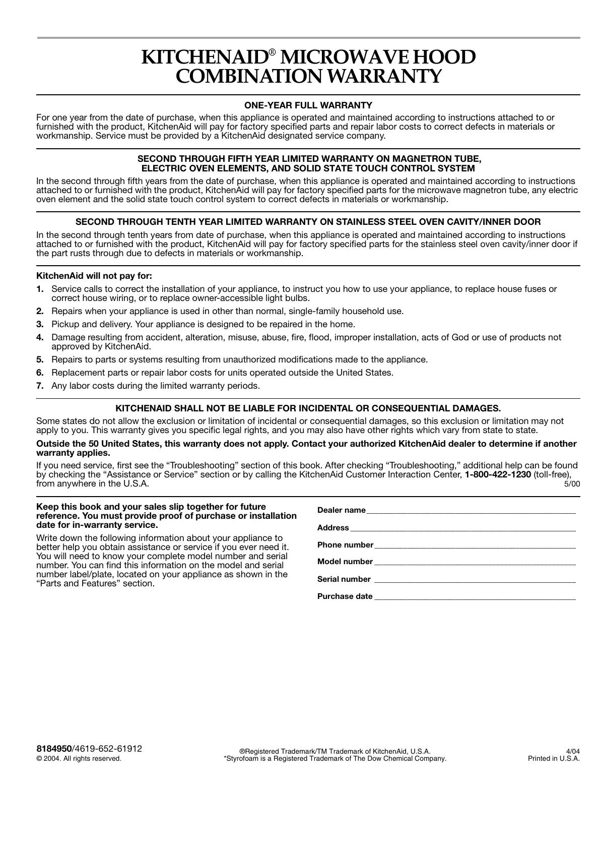 attached to or furnished with the product, KitchenAid will pay for factory specified parts for the microwave magnetron tube, any electric