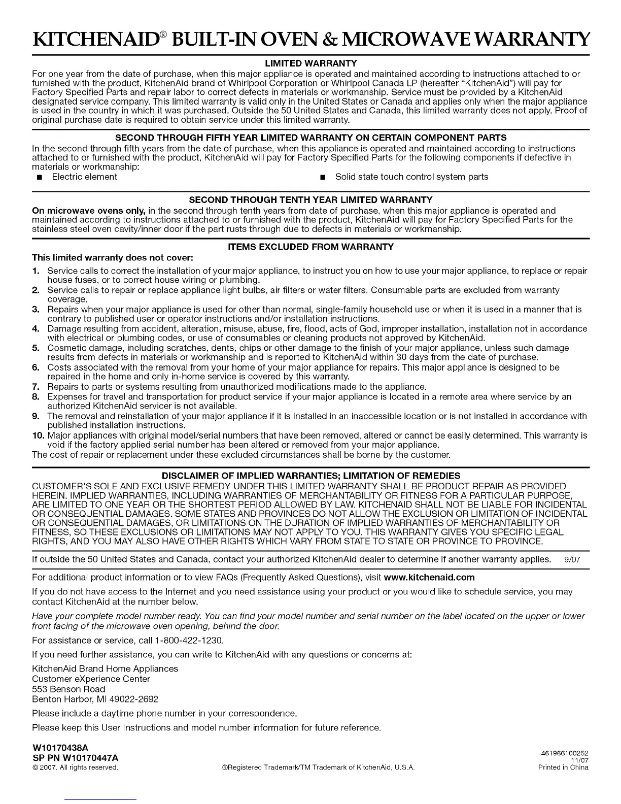 KITCHENAID ®BL LT-IN OVEN & MICROWAVE WARRANTY