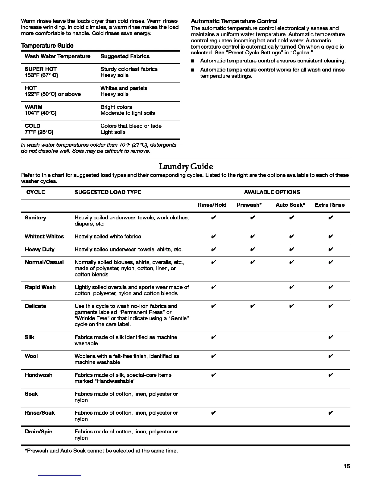 Refer to this chart for suggested load types and their corresponding cycles. Listed to the right are the options available to each of these