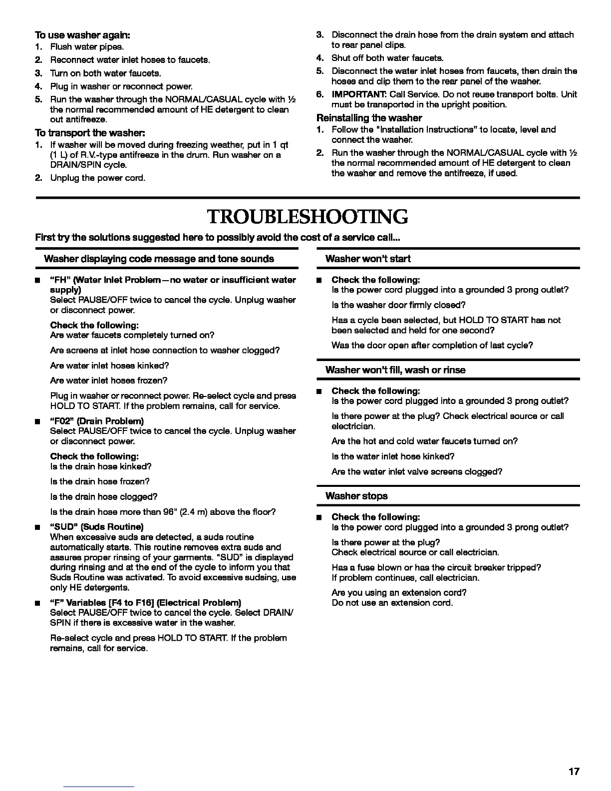 6. IMPORTANT: Call Service. Do not reuse transport bolts. Unit