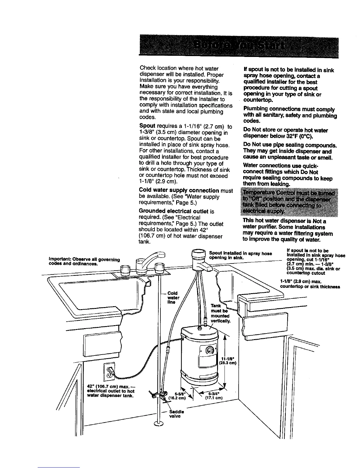 (106.7 cm) of hot water dispenser