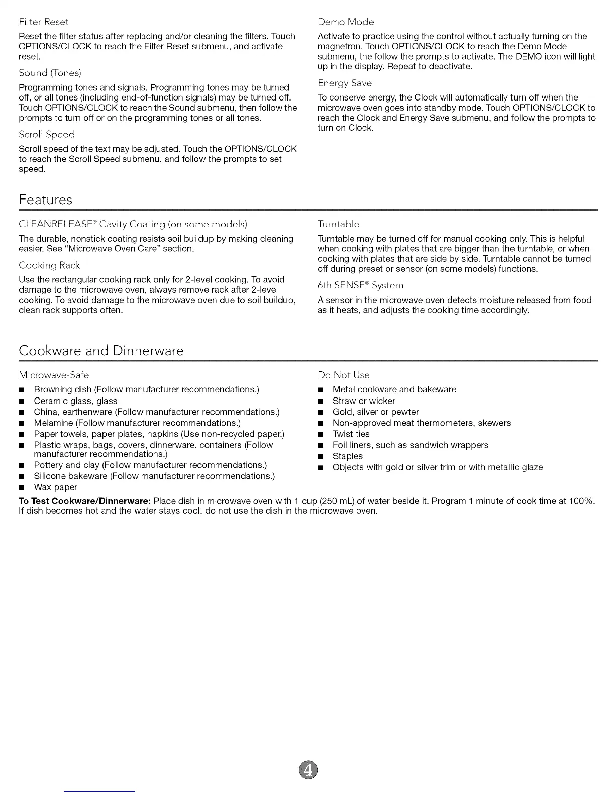 To Test Cookware/Oinnerware; Place dish in microwave oven with 1 cup (250 mL) of water beside it. Program 1 minute of cook time at 100%.