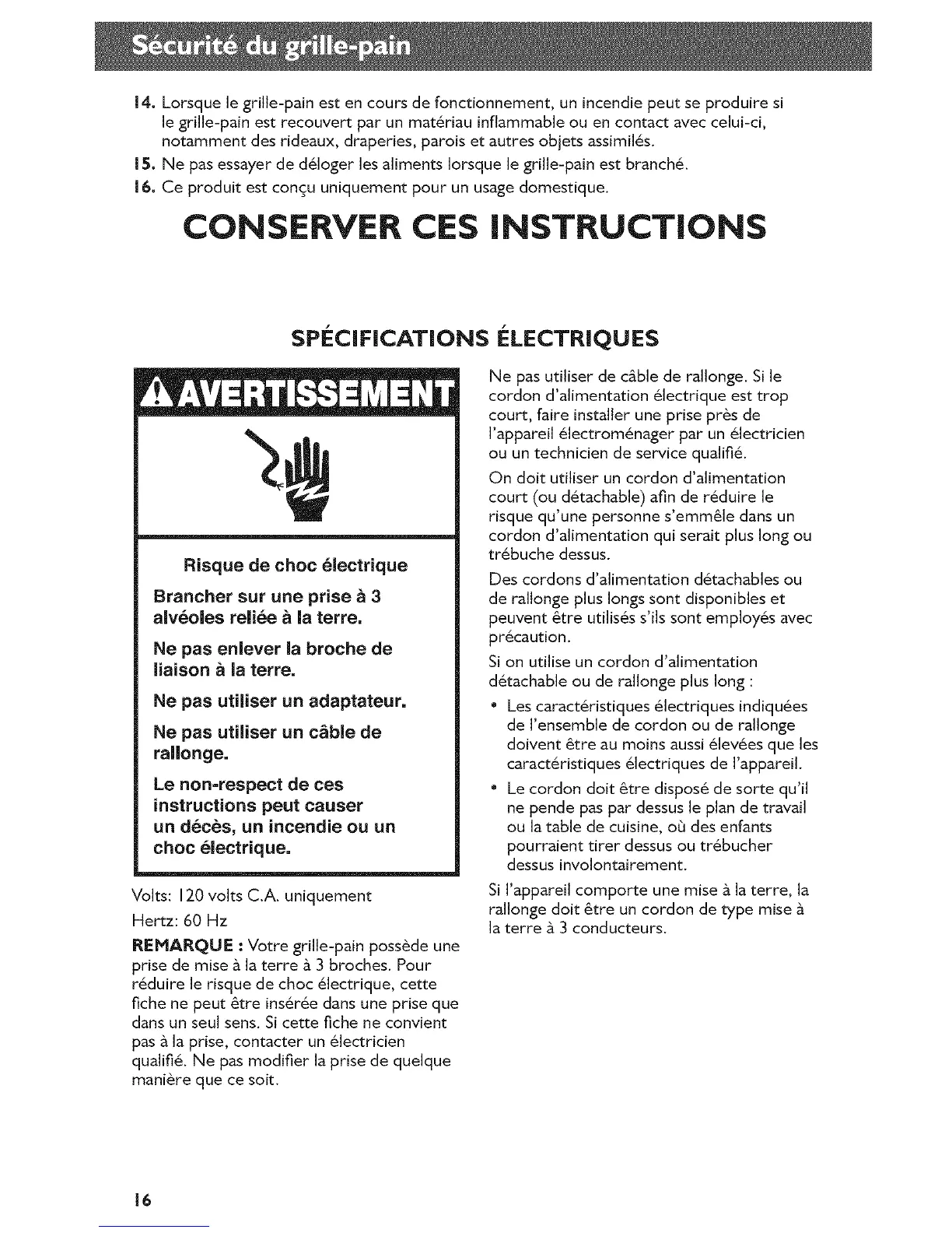 15. Ne pas essayer de d61oger les aliments Iorsque le grille-pain est branch,.