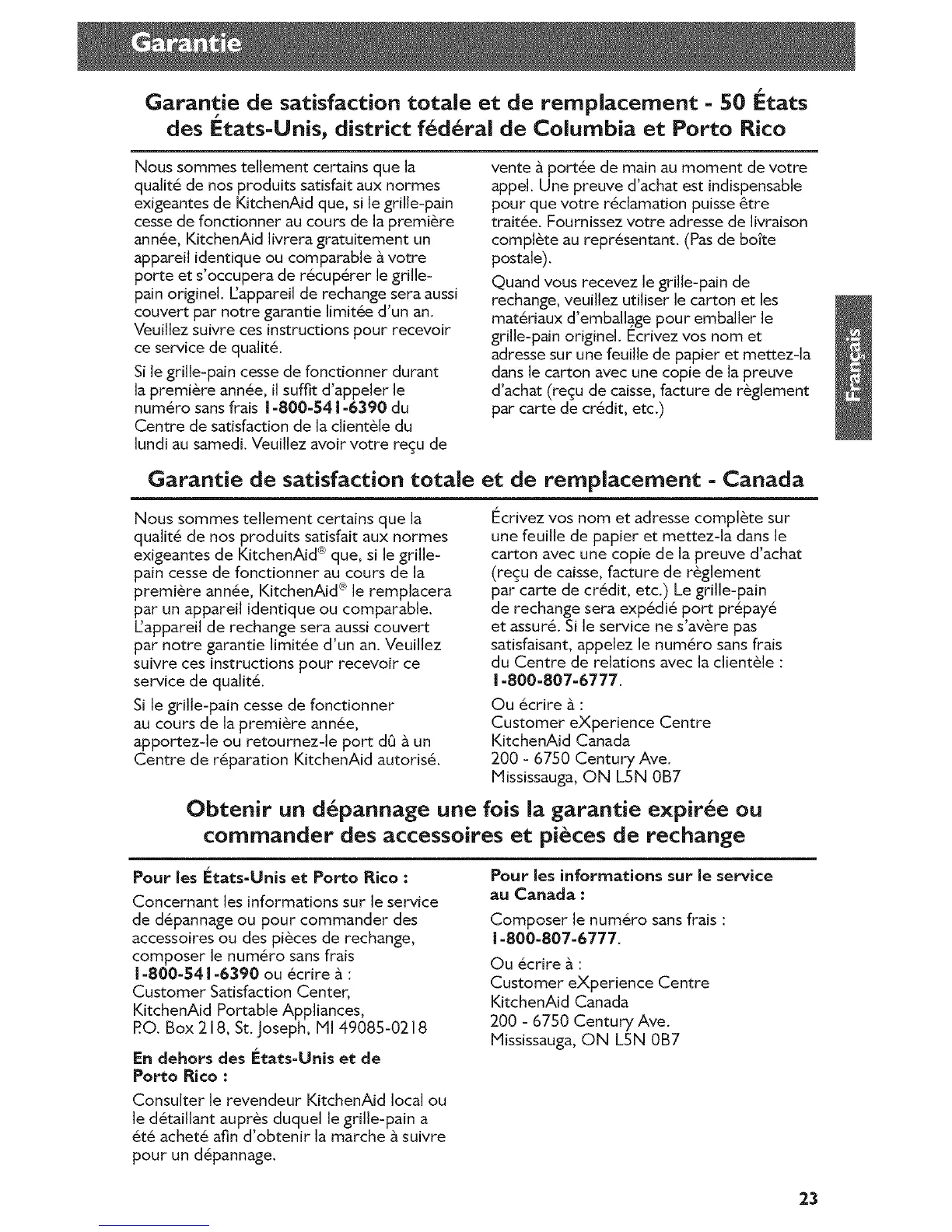 Garantie de satisfaction totale et de remplacement - Canada