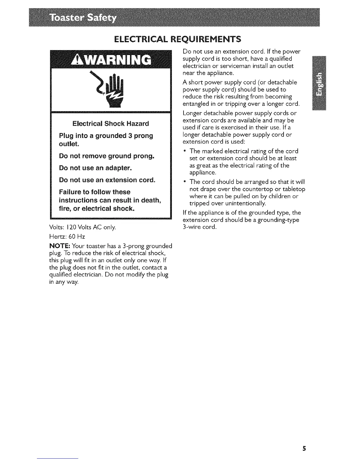 NOTE: Your toaster has a 3-prong grounded