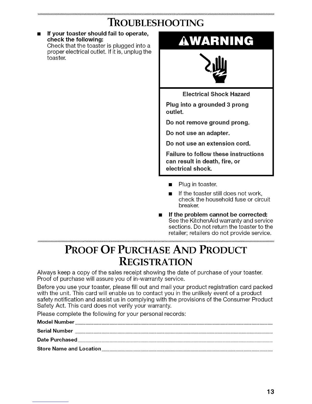 Always keep a copy of the sales receipt showing the date of purchase of your toaster.
